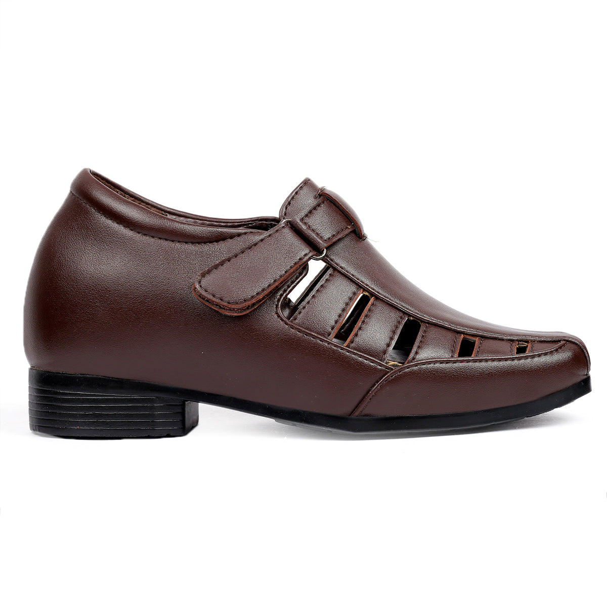 - Material : You'll Love This Light Weight Hidden Height Increasing Formal Elevator Roman Sandal It Features A Faux Leather Upper, Synthetic Leather Inner, Velcro On Style For Easy Fit, Soft Lining, Cushiony Memory Foam Insole For Comfort And Support, And A Non-Marking Outsole. Manmade Materials.