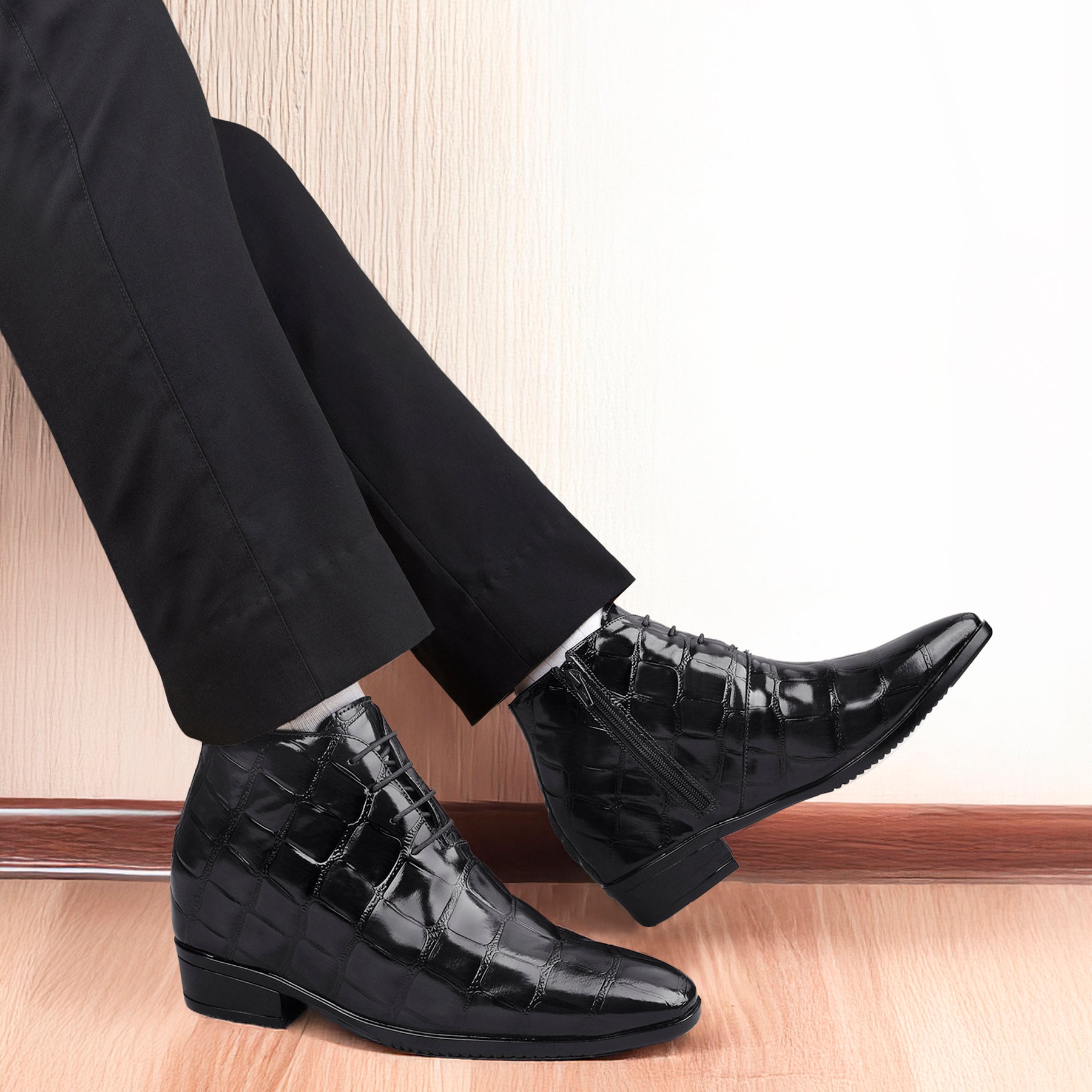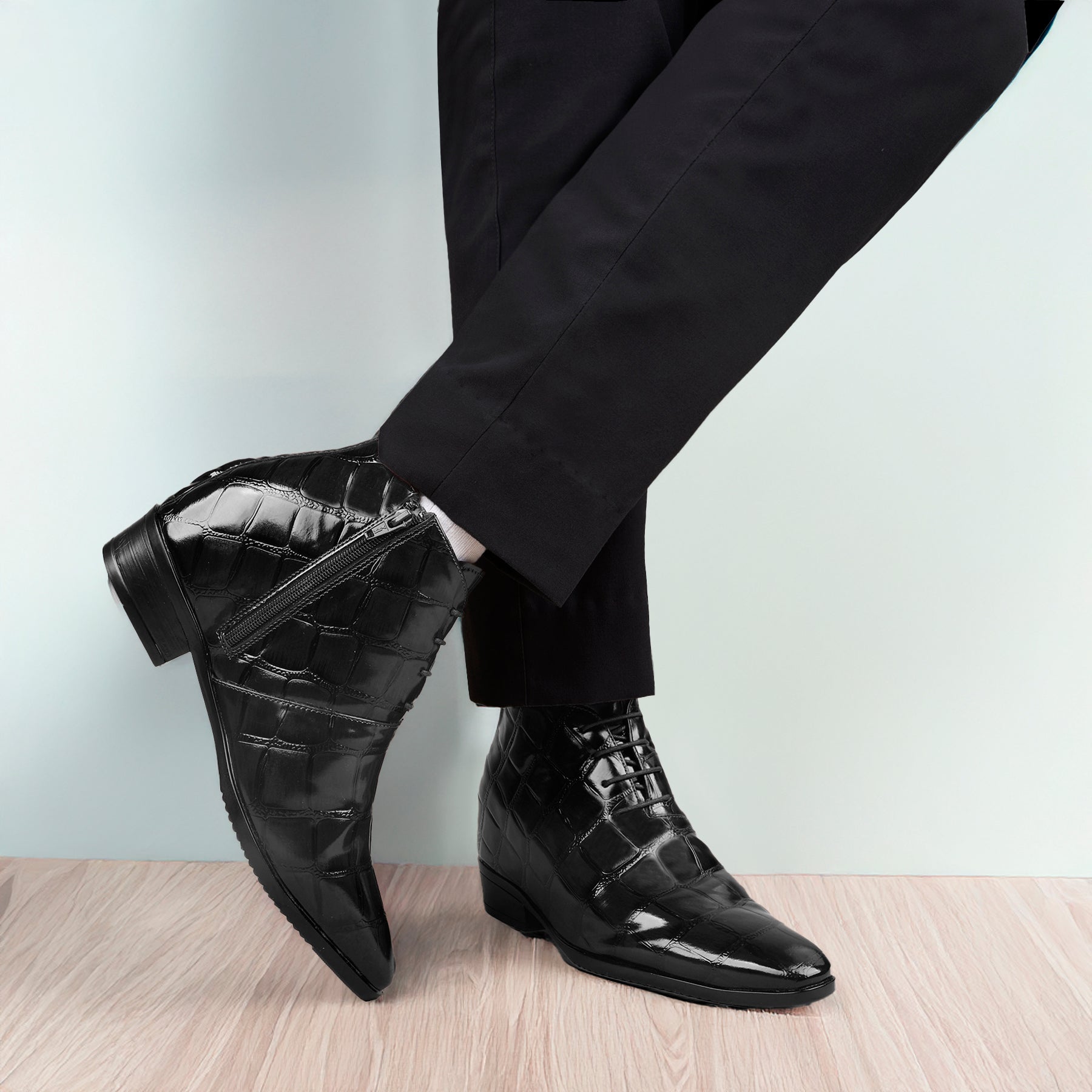 Elevate your formal attire with these Men’s 3.5" Elevator Boots, crafted in premium glossy black leather. Designed to discreetly add height while maintaining a sleek, polished appearance, these boots combine sophisticated style with expert craftsmanship. Ideal for formal occasions, they offer both confidence and comfort, enhancing your posture and presence effortlessly.
